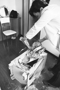 十幾平方米的休息室內凌亂不堪,地面撒滿混凝土殘渣,一臺半米多高、已經被“開膛破肚”的保險柜橫躺在地上。保險柜從側面被打穿,最外層的鐵皮已被完全撕開,中間三四厘米厚的混凝土大面積脫落,最里層的鐵皮被掏出一個大洞,側面的鐵皮上有被工具刺穿的明顯痕跡,保險柜正面還標有“某某保險公司承!钡淖謽印